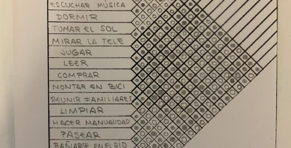 Esta actividad era muy ambigua pero fue muy interesante, se trataba de colocar acciones que se hacen o que podrían hacer nuestras "clientas" en la casa de Argelita que vamos a hacer. Luego, debíamos marcar si tenían relación o no, y me he dado cuenta que es muy personal, ya que cosas que yo pienso que sí son compatibles, otros piensan que no y viceversa, me parece muy curioso llegar a diferentes conclusiones. Al terminar la tabla, creamos etiquetas donde pusimos algunas de las acciones y las intentamos relacionar por grupos ya sea por si se realiza en el exterior o interior, colectivamente o solo... Después, fuimos creando patrones entre estas mientras discutíamos donde debíamos colocar cada una.